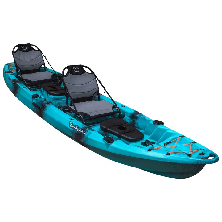Discover the Vanhunks Bluefin 12’0 Tandem Kayak designed to elevate your family outings, and solo paddling adventures. Crafted using robust 5mm polyethylene infused with UV protection during molding. The Bluefin stands as a beacon of durability and longevity. Premium inserts and fixtures, secured with marine grade stainless steel bolts and brass inserts for exceptional build durability. Transportation becomes a breeze with molded in handles placed on the sides, bow, and stern of the kayak. With an impressive weight capacity of 551lb / 250kg, paddlers of all skill levels can enjoy this kayak. Unmatched Hull Technology: The Bluefin 12’0 Tandem Kayak’s design is centered around accessibility to storage compartments and effortless maneuverability. The hull’s intelligent construction features a deep V-shape at the Bow, transitioning into a flat midsection adorned with deep twin arches in a pronounced V at the stern. This configuration guarantees stability and an effortlessly smooth paddling experience.