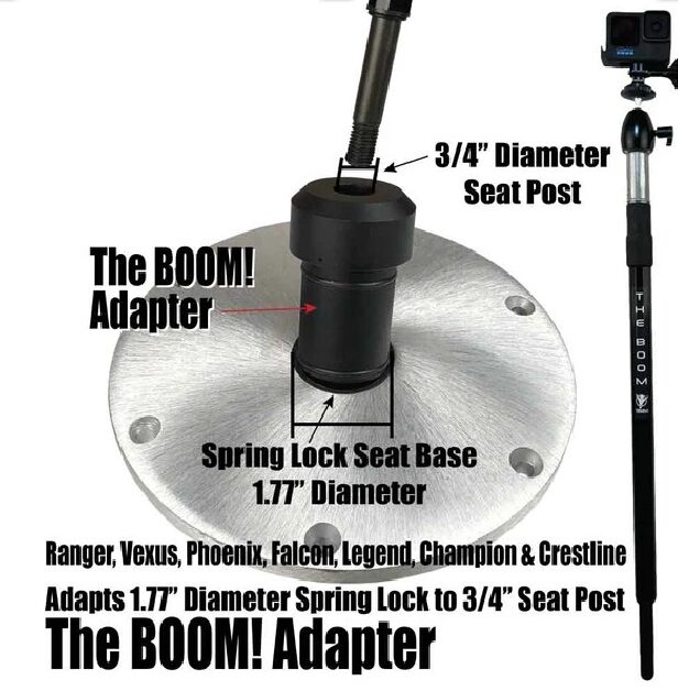 THE BOOM! Micro is the epic action camera mount you have been waiting for to hold your GoPro, Tactacam, DJI, or any action camera. Secures into your 3/4″ seat connector on your boat. Made of aircraft grade aluminum. Extremely strong.  Extends from approx 26″ to 36″ to help you get those amazing shots. You won’t believe it until you see it. You will love this epic mount. Fits all boats with a 3/4″ seat post: Triton, Nitro, Skeeter, BassCat, Bullet, Gambler, G3, & other boats with a 3/4″ seat post. Attention Ranger, Vexus, Phoenix, Falcon, Legend, Champion & Crestline boat owners… please select the option with the 1.77″ to 3/4″ adapter for The BOOM! to fit your boat… Other Seat Post Adapters for The BOOM! sold separately. • Springfield Hi-Lo Taper-Lock to 3/4″ Part 1600409 9″ tall: from iBoat Click here • Springfield 2 3/8″ plug in base: Springfield does not make an adapter, so you would have to take a spare post or purchase this one (3300712 Click here) and create your own custom to 3/4″ adapter on top.